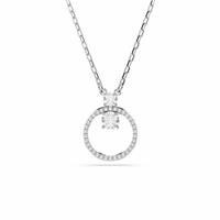 A modern twist on the classic circle pendant, this rhodium-plated piece features a central pav ring of clear Swarovski Zirconia, secured by two larger prong-set Swarovski Zirconia. Length: 38 - 45cm Motif Size: 1.9 x 1.4cm Item Code: 5692261 - Manufacturers part number: Swarovski_9009656922613