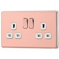Be on trend with the Fusion Rose Gold switched socket. The premium metal font plate has a sophisticated copper rose tone and is screwless and removable which is handy when you come to decorate. Terminals are colour coded with captive screws to aid installationThis product is a 13amp 2 gang switched socket. Complete the look with other Fusion electrical switches and sockets available in Rose Gold - Manufacturers part number: 1122GBRG