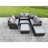 This outdoor rattan lounge sofa set is a great addition to patio or garden, made of high quality PE rattan and durable galvanized steel construction for sturdiness and long lasting.Durability ,and can be put outdoor all year round. Perfect set to sit round with your family and friends. Set Dimensions: 1 x Side coffee table 65L x 65W x 66H cm; 2 x Big footstool 65L x 65W x 34H cm; 3 x Love Sofa Size: 124W x 67D x 79H cm; 1 x Oblong Coffee Table 85L x 50W x 37H cm; Dark grey mixed rattan with dark grey fa...