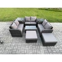 This outdoor rattan lounge sofa set is a great addition to patio or garden, made of high quality PE rattan and durable galvanized steel construction for sturdiness and long lasting.Durability ,and can be put outdoor all year round. Perfect set to sit round with your family and friends. Set Dimensions: 2 x Side coffee table 65L x 65W x 66H cm; 2 x Big footstool 65L x 65W x 34H cm; 3 x Love Sofa Size: 124W x 67D x 79H cm; 1 x Oblong Coffee Table 85L x 50W x 37H cm; Dark grey mixed rattan with dark grey fa...