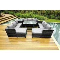 Set Dimensions: 3 x 3 Seater sofa with double armrest: 177W x 65D x 66H cm; 1 x Dining table size: 110L x 70W x 70H cm; 1 x Coffee table: 65L x 65W x 34H cm; 2 x Big footstool £65L x 65W x 34H cm; Dark grey mixed rattan with dark grey fabric .Color may vary due to light or monitor .we are unable to return the item due to this problem .Please consult us before purchase if you have requirements on color saturation,the product is delivered on pallet,to kerbside only.