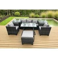 Set Dimensions: 1 x 3 Seater sofa with double armrest: 177W x 65D x 66H cm; 2 x Chair: 74W x 65D x 66H cm; 1 x Dining table size: 110L x 70W x 70H cm; 2 x Coffee table: 65L x 65W x 34H cm; 1 x Big footstool £65L x 65W x 34H cm; Dark grey mixed rattan with dark grey fabric .Color may vary due to light or monitor .we are unable to return the item due to this problem .Please consult us before purchase if you have requirements on color saturation,the product is delivered on pallet,to kerbside only.