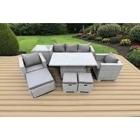 Set Dimensions: 1 x Three Seater Sofa : 177W x 65D x 66H cm; 2 x Arm chairs size: 74L x 65W x 66H cm; 1 x Side coffee table £65L x 65W x 66H cm; 1 x PC Rising dining table: 140L x 80W x 68/48H cm(height up 68, down 48); 1 x Big Foot Stool: 65L x 65w x 34H cm; 2 x Small fully assembled footstools £40L x 40W x 34H cm; Light grey mixed rattan with dark grey fabric .Color may some difference due to light or monitor .we are unable to return the item due to color problem.the product is delivered on pa...