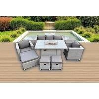 Set Dimensions: 1 x Three Seater Sofa : 177W x 65D x 66H cm; 1 x Fire Pit Table £140L x 80W x 69H cm; 1 x Big Foot Stool: 65L x 65w x 34H cm; 2 x Fully Assembled Stool: 40L x 40w x 34H cm; 2 x Side coffee table £65L x 65W x 66H cm; 2 x Chairs: 74L x 65W x 66H cm; Light grey mixed rattan with dark grey fabric .Color may some difference due to light or monitor .we are unable to return the item due to color problem.the product is delivered on pallet,to kerbside only