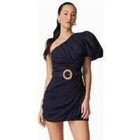 Elliatt Kara Asymmetrical Mini Dress Size & Fit True to size - order your usual size Mini length Available in sizes XS - XXL Details Kara Asymmetrical Mini Dress by Elliatt Navy Asymmetric neck Short puffed sleeve One shoulder Rattan buckle belt Concealed side zip fastening Material & Care Material Content: S: 80% VISCOSE 20% LINEN L: 100% RAYON Washing Instructions: Dry Clean Only