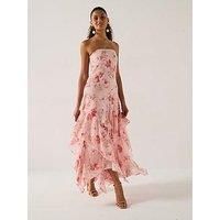 Forever New Sharpay Sheer Floral Ruffle Dress Size & Fit True to size - order your usual size Regular fit Midaxi length Available in sizes 6 - 16 Details Sharpay Sheer Floral Ruffle Dress by Forever New Pink Sleeveless design Strapless hanky hem dress Back zip fastening Ruffled with ditsy floral print Material & Care Material Content: 100% Poly Georgette Washing Instructions: Hand Wash Only