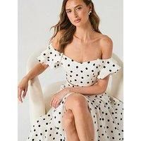 Forever New Indiana Off The Shoulder Top Size & Fit True to size - order your usual size Regular fit Available in sizes 6 - 16 Details Indiana Off The Shoulder Top by Forever New Cream Polka dot print Bardot neckline Cropped Frill detail cap sleeves Sweetheart neckline Back zip fastening Material & Care Material Content: 94% Lyocell 6% Linen Washing Instructions: Hand Wash Only - Manufacturers part number: WMAHJ