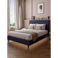 XR Living Maisie Fabric Bed Frame with Underframe Lighting in Double and King Sizes - Navy Upholstered in a rich, softly textured velvet fabric that comes in a navy shade, this Maise bed frame by XR Living boasts a stunning padded headboard you can lean against when sitting up in bed. Vertical stitching adds extra visual interest, and it sits on smooth tapered feet which raise it off the floor. And to ensure the bed is always the centrepiece of your room - even at nighttime! - it's detailed with LED RG...