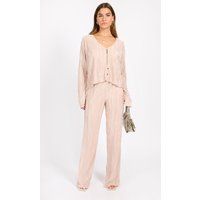 The Champagne Plisse Top is the perfect blend of sophistication and style. Featuring a V-neck and long sleeves, this top offers a flattering regular fit and length that pairs beautifully with any outfit. Crafted from a textured plisse fabric, it adds a touch of elegance to your wardrobe, making it an essential co-ord piece for versatile styling. | Little Mistress Women's Champagne Plisse Trousers in Natural | Size: XL - Manufacturers part number: Little Mistress_9501532963913