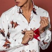 Pheasants Courting print on a solid colour base dotted with feathers.100% Satin CottonNew Pheasant PatternDouble Button NeckInside placket detailsAdjustable button cuffsConcealed Under-Collar ButtonCL1866 | CLAUDIO LUGLI Men's Courtship Pheasants Print Shirt in White | Size: Large - Manufacturers part number: CL1866
