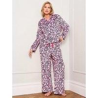 Jim Jam The Label Pink Animal Print Pyjamas - Pink Animal Fun, Funky & Snuggly! The luxurious pyjama set you all need. This fabric has a beautiful handfeel, perfected with a stylish collar, the trousers feature an elasticated waistband and have a loose silhouette giving the perfect fit for both sleeping or lounging in & the garment has been finished off with tonal satin ties to complete the look. Material Content: 95% Polyester 5% Elastane Washing Instructions: Machine Washable