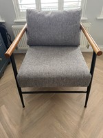 This Grey chair with a medium oak wood effect arm is a stylish accent chair for adults. Made with a metal frame and requiring assembly, this indoor chair from Dunelm is 80cm in height, 76cm in length, and 70cm in width. The elegant grey colour and wood tone add a touch of sophistication to any living space, making it a chic addition to your home decor.