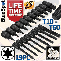 48mm Long :T10, T15, T20, T25, T27, T30, T40, T45, T50, T55, T60. 110mm Long :T25, T27, T30, T40, T45, T50, T55, T60. The Blue Spot Tools 19 PCE 3/8" impact torx bit sockets are designed for use with 3/8" drive hand power and air tools.