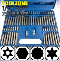 Report incorrect product information74pc 3/8" & 1/2" Special Bit Set. Hex - Ribe - Spline - Torx - Tamperproof Torx. Hardened & Tempered Steel. 1pc 3/8" Square Drive x 10mm Hex Drive. 1pc 1/2" Square Drive x 10mm Hex Drive. Precision Machined Drop Forged Heat Treated Hardened & Tempered.