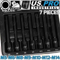 M5 - M6 - M8 - M9 - M10 - M12 - M14. 7 PIECE 3/8" DRIVE EXTRA LONG IMPACT SPLINE BIT SOCKET SET. DRIVE SIZE : 3/8" DRIVE. SET INCLUDES LENGTH : 110MM LONG.