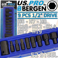 SIZES : H6 - H7 - H8 - H10 - H12 - H14 - H17 - H19. 9 PIECE 1/2" DRIVE HEX BIT SOCKET SET. INCLUDES 1/2" DRIVE BIT HOLDER. DRIVE SIZE : 1/2" DRIVE. HEAT TREATED. NUMBER OF PIECES : 9 PIECE.