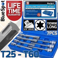 Report incorrect product informationT25 - T30 - T40 - T45 - T50 - T55 - T60. 7 PIECE 3/8" DRIVE EXTRA LONG TORX BIT SOCKETS. DRIVE SIZE : 3/8" DRIVE. SET INCLUDES LENGTH : 110MM LONG.