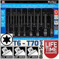 BLUESPOT 15 PIECE EXTRA LONG IMPACT TORX BIT SOCKET SET ( T6 - T70 ). CHOMRE VANADIUM SOCKETS WITH HARDENED S2 BITS FOR ENHANCED DURABILITY. 1/4" DRIVE : T6 - T8 - T10 - T15 - T20 - T25 - T27 - T30. 3/8" DRIVE : T40 - T45 - T47 - T50 - T55.