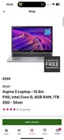 Report incorrect product informationThe Aspire 3 Laptop by Acer offers a sleek silver design with a 15.6-inch FHD screen, Intel Core i5 processor, 8GB of RAM, and a spacious 1TB SSD. This laptop is perfect for casual computing tasks, featuring Intel Iris Xe Graphics for integrated graphics capabilities. With a maximum resolution of 1920 x 1080, this notebook is suitable for everyday use and comes with a 1-year manufacturer warranty. Running on Windows 11 Home, this unit provides reliable performance and connectivity options with HDMI ports, making it a convenient choice for users seeking a balance of power and style in their computing experience. Will send double boxes also the laptop has only been taken out the box .
