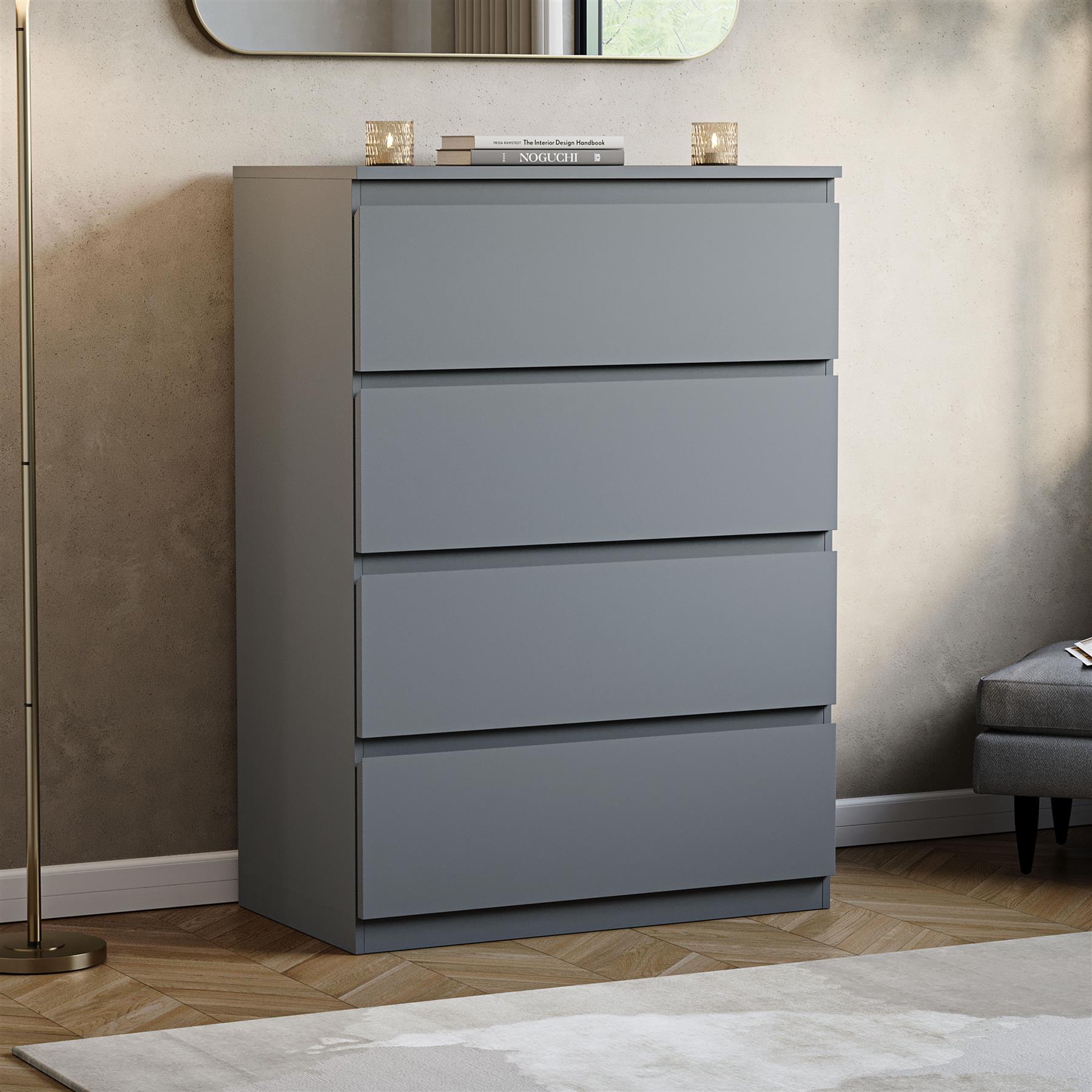 Report incorrect product informationIntroducing our sophisticated Denver 4 Drawer Chest of Drawers, a perfect blend of modern minimalist design and practical functionality. This piece of bedroom furniture features a sleek, handle-free design that enhances any contemporary decor with its clean lines and uncluttered aesthetic.