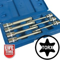 Torx Socket Bit Set manufactured from chrome vanadium steel featuring extra long 110mm shafts for hard to reach areas that conventional bits cannot reach. Sizes: T25, T30, T40, T45, T50, T55 & T60. Manufactured from chrome vanadium steel. Extra-long 110mm shaft for hard to reach areas. Brand: BlueSpot. Comes with BlueSpot Lifetime Guarantee. Simply register online within 30 days of purchase. More details can be found on the reverse of the product. .