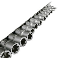 14pcs External/Female TORX Bit Set with 1/4in, 3/8in and 1/2in drive, ideal for motor mechanics and DIY hobbyists. 5pc 1/4" Sockets: E4, E5, E6, E7 And E8. 4pc 3/8" Sockets: E10, E11, E12 And E14. 5pc 1/2" Sockets: E16, E18, E20, E22 And E24. Includes Socket rail. Knurled grip. Produced from CRV. Made to last. Brand: Toolzone. .