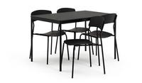 Report incorrect product informationStella Wood Effect Dining Table & 4 Black Chairs Description Table: ------Table size H75, W80, L120cm. ------Wood effect table with metal legs. ------Wood effect table top finish. ------Self-assembly - 2 people recommended. Chair: ------Includes 4 chairs. ------Size of each chair H80, W41, D43cm. ------Seat height 44cm. ------Metal frame with metal legs. ------Wood effect seat pad. ------Self-assembly. ------Maximum user weight per chair 130kg. ------Individual chair weight 3.7kg. Package Dimensions: ------Table package 1 size H8, W129, D88cm. ------Individual chair package size H67, W77, D72cm. Delivery Please note that we deliver to UK Mainland addresses only and it excludes Highlands, Islands and Northern Ireland if in doubt please email before purchasing as additional charges may apply.