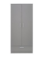 Panama 2 Door, 1 Drawer Wardrobe - Grey Description ---Dimensions: Height 180.1, Width 79.9, Depth 52.7 cm ------Assembly: Self Assembly ------Depth: 52.7 CM ------Height: 180.1 CM ------Width: 79.9 CM ------Handle Material: Metal ------Number of Doors: 2 door ------Number of Drawers: 1 ------Runner Detail: Metal ------The wardrobe contains a hanging rail and matching interior finish, while a single drawer sits on easy-glide metal runners for a smooth, friction-free opening. ------The wardrobe is finished with metal handles for a sleek, modern accent.