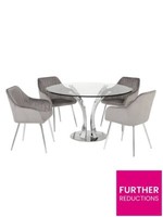 Alice Glass Top Dining Table + 4 Alisha Chairs - Chrome/Grey Description ---Dimensions: Table - Height (to underside) 75.2, Diameter 130 cm Chairs - Height 83, Width 58.5, Depth 55 cm ------Assembly: Part Assembled ------Depth: 130 CM ------Height: 75 CM ------Material Content: Glass, Foam, Velvet fabric, Chrome tube ------Width: 130 CM ------Easy home assembly ------Easy to clean ------stylish ------Chair Width (in cm): 58.5 ------Chair Depth (in cm): 55 ------Chair Seat Height (in cm): 83 ------Table Height to underside (in cm): 75.2 ------Table Length (in cm): 130 Delivery Please note that we deliver to UK Mainland addresses only and it excludes Highlands, Islands and Northern Ireland if in doubt please email before purchasing as additional charges may apply.