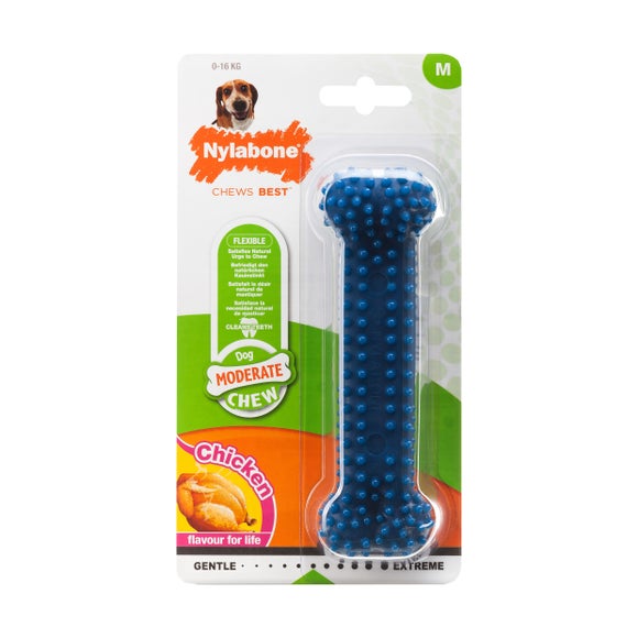 Report incorrect product information* Durable dog chew* Chicken flavoured* Long lasting Help support your dogs oral health with the Nylabone dental dog bone, a durable chew designed to freshen breath and reduce plaque through textured dental ridges. Made from tough, longlasting material infused with savoury chicken flavour, it keeps dogs engaged while promoting healthy chewing habits that discourage destructive behaviour.