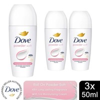 Report incorrect product informationGlobally, Dove does not test on animals. An antiperspirant deodorant providing up to 48 hours of sweat and odour protection. This antiperspirant glides on easily for a smooth application. Box Contains: 3x Dove Powder Soft Roll On Anti-Perspirant, 50ml.