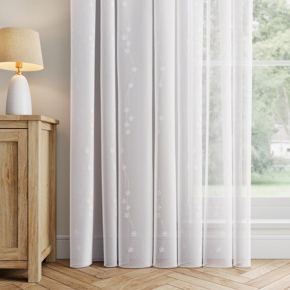 Report incorrect product information* Lightweight and airy composition* Soft embroidered Daisy design* Available in a selection of header options* Coordinating Made to Measure Voile Curtain available to purchase separately Infuse your space with charm using the Daisy Made to Measure Voile Curtain. This lightweight, airy fabric features a soft embroidered daisy pattern, offering a whimsical, boho-inspired look. Perfect for creating bespoke curtains that provide privacy without blocking natural light, its a refreshing choice for any room. C...