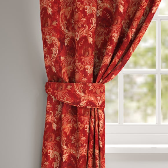 * Made to Order* Classic damask design* Red colourway* Velvet base fabric made from recycled polyester* Choose plain or piped edge* Coordinating Made to Measure items available to purchase separately* Made in UK The Celeste Made to Order tiebacks are the perfect complement to our matching Made to Measure curtains. Add a bespoke finish and keep your curtains looking neat and tidy. Featuring a classic Damask design on a deep, dark, luxurious red colourway, these tiebacks are bold, vibrant, and stylish. Th...