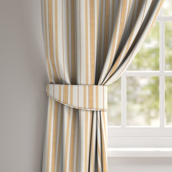 Report incorrect product information* Made to Order* Timeless stripe design* Available in different colourways* Polycotton and linen composition* Choose plain or piped edge* Coordinating Made to Measure items available to purchase separately* Made in UK Add character and warmth to your space with the Barsby Made to Order tiebacks. Featuring a timeless stripe design in a range of colourways, these tiebacks are versatile across various interior styles and rooms. The colorful stripes sit on a natural background creating a cosy, inviting feel...
