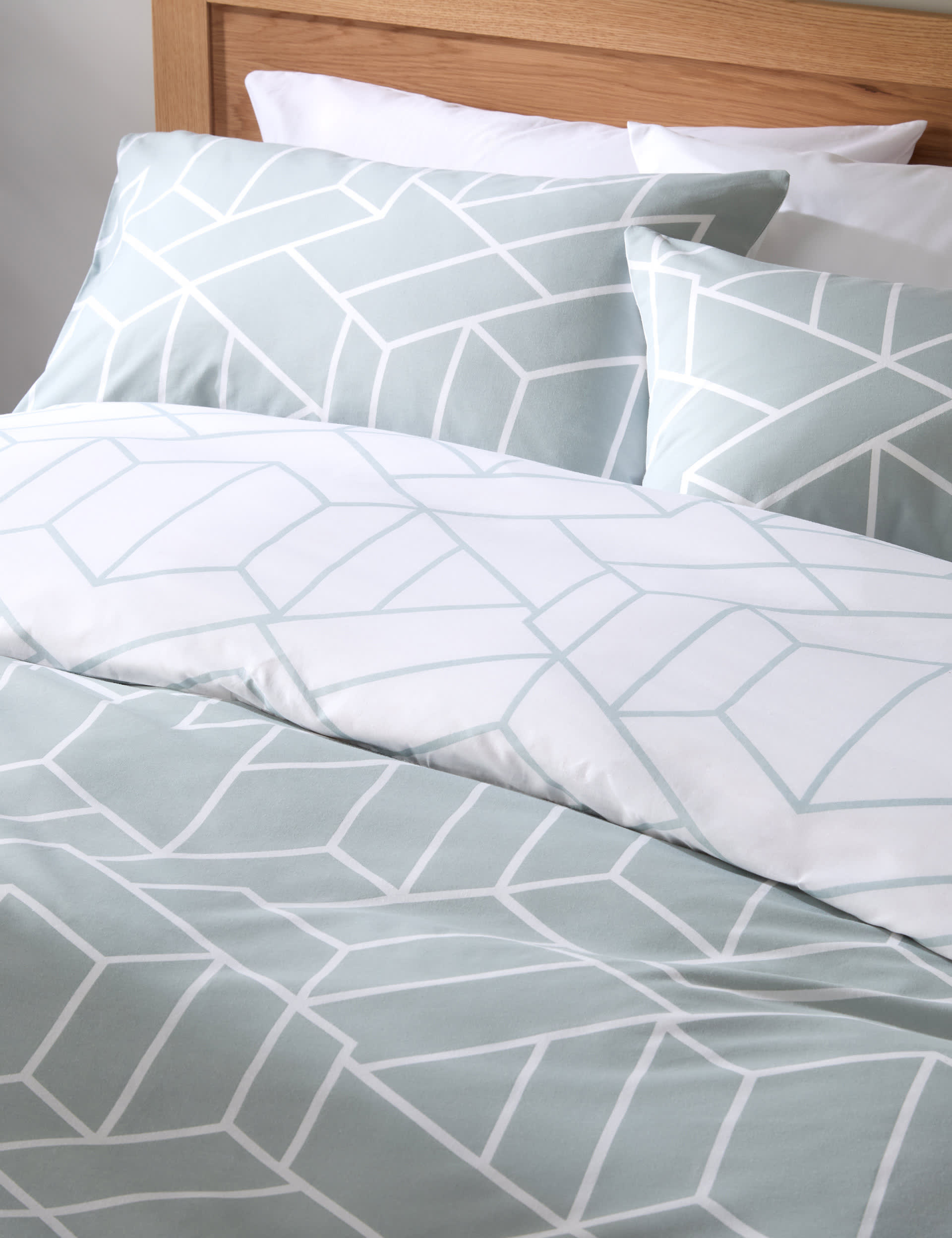This cotton blend bedding set features a striking geometric pattern for modern bedroom style. The lightweight fabric promotes a cool and comfortable night's sleep, while the easycare finish ensures minimal fuss on laundry day. Complete with our newer-for-longer technology, this practical bedding set maintains its quality wash after wash.