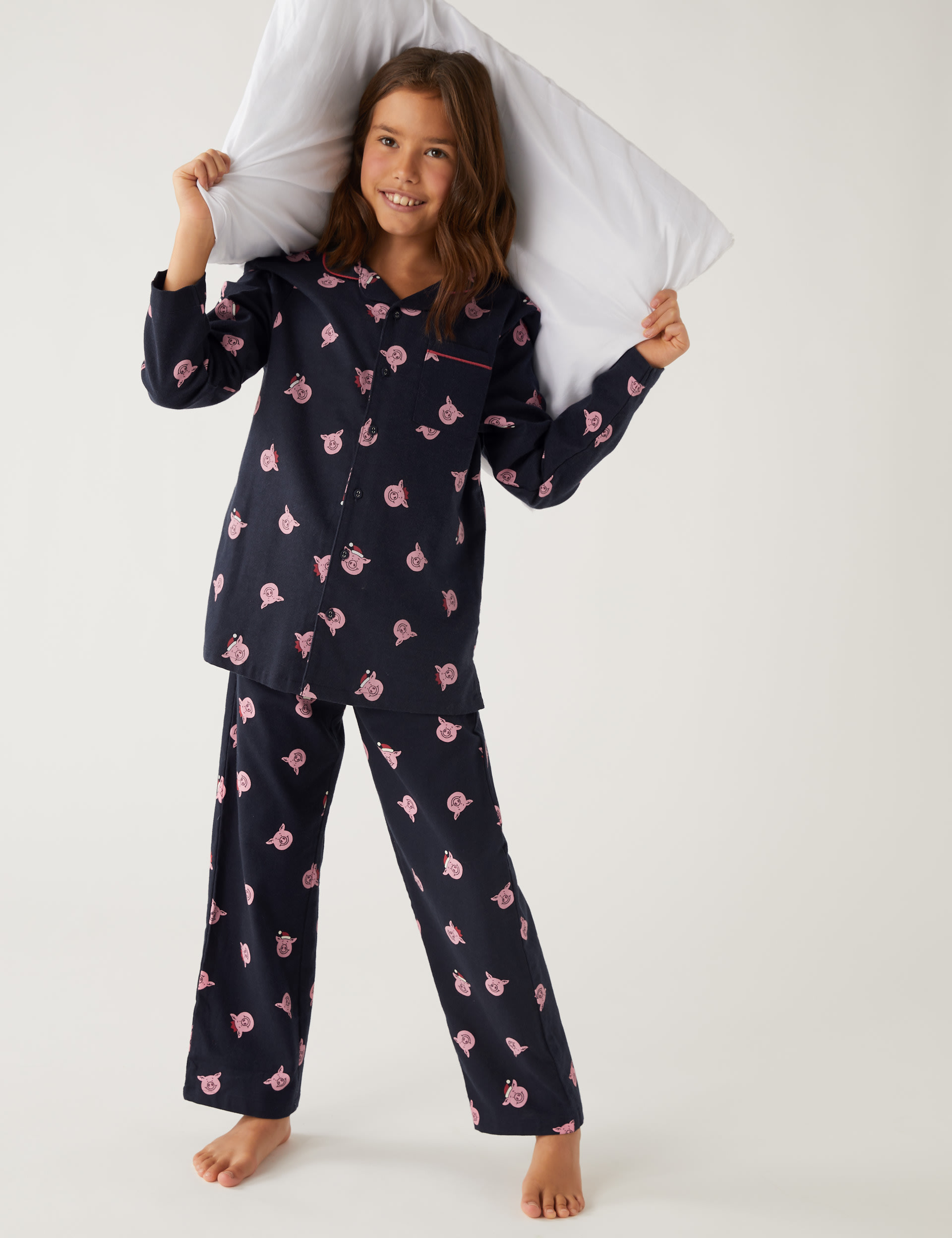 Report incorrect product informationThese pure-cotton Percy Pig print pyjamas are sure to become their new bedtime favourites. Designed in a comfy regular fit with long sleeves and button-through fastening. Embroidered with piping on the collar and pocket for a standout finish. We only ever use responsibly sourced cotton for our clothes.
