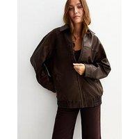 New Look Oversized Washed Faux Leather Jacket Size & Fit True to size - order your usual size Oversized fit Available in sizes 6 - 22 Details Oversized Washed Faux Leather Jacket - Dark Brown by New Look Brown Regular collar Zip up fastening Side seam pocket Long sleeves Elasticated hem Material Content: Lining - Polyester (100.0%); Shell 1 - Polyester (100.0%); About the brand: